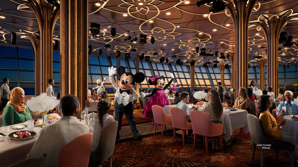 Aboard the Disney Adventure, guests enjoy rotational dining across six themed restaurants with personalized service and live character interactions.